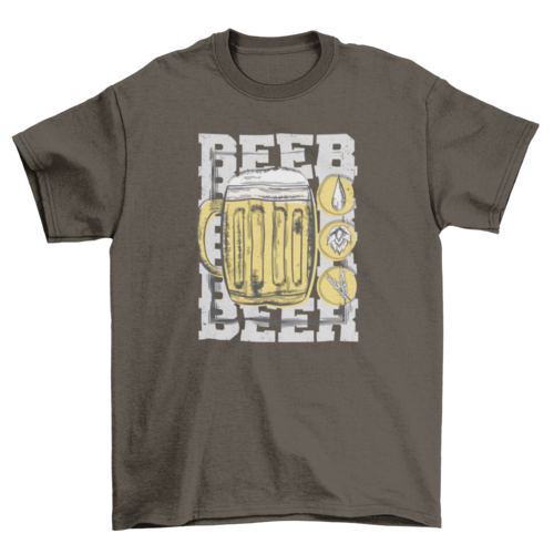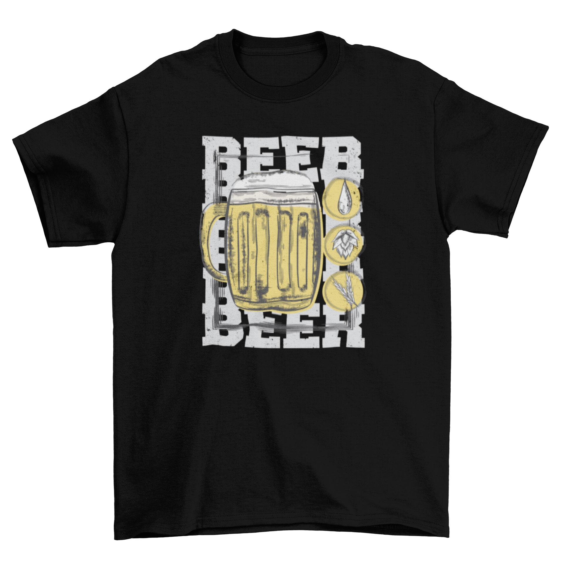 T-shirt design featuring a glass of beer and the word BEER three times.