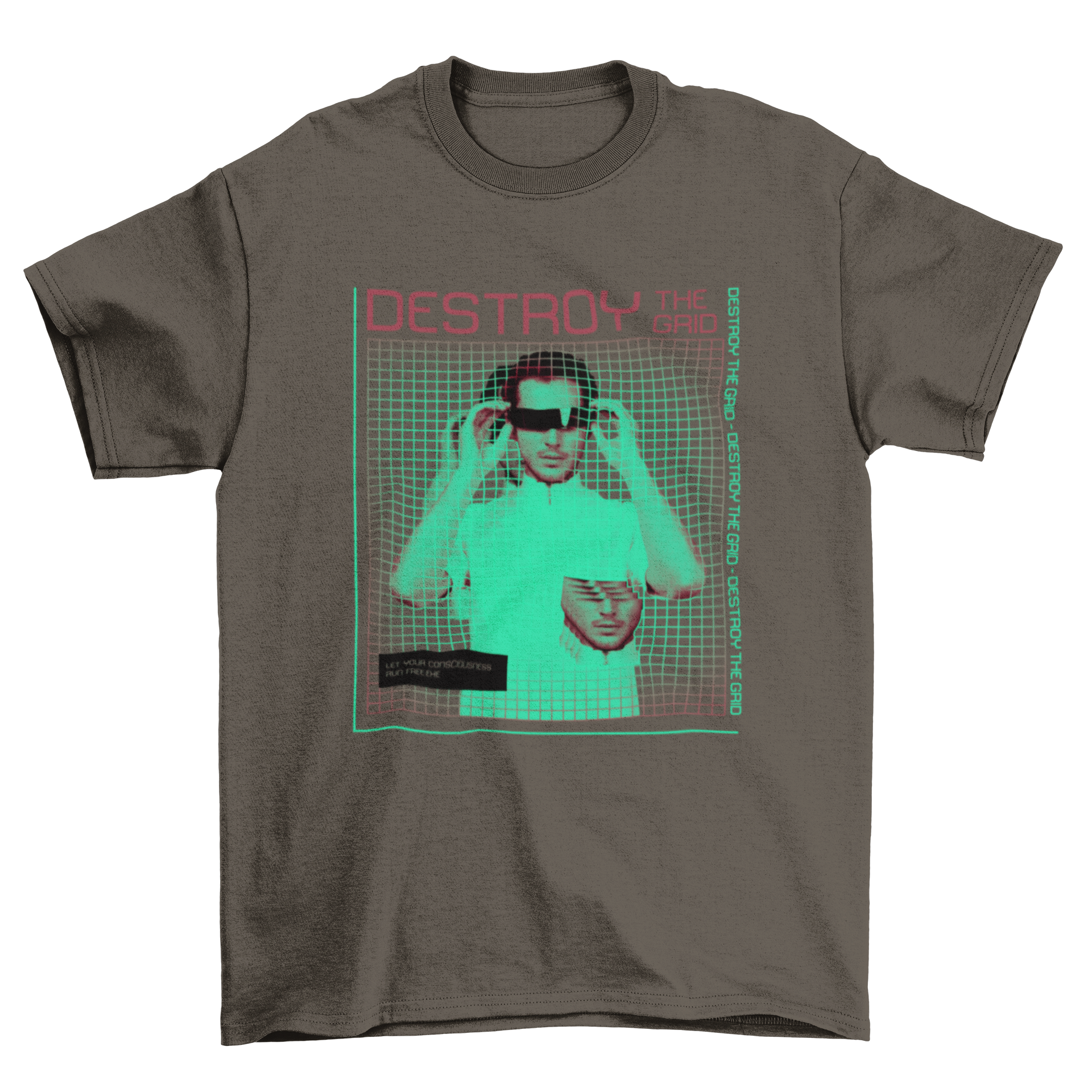 Incredible t-shirt design featuring a man with glasses in a grid in vaporwave style with quote "Destroy the grid".