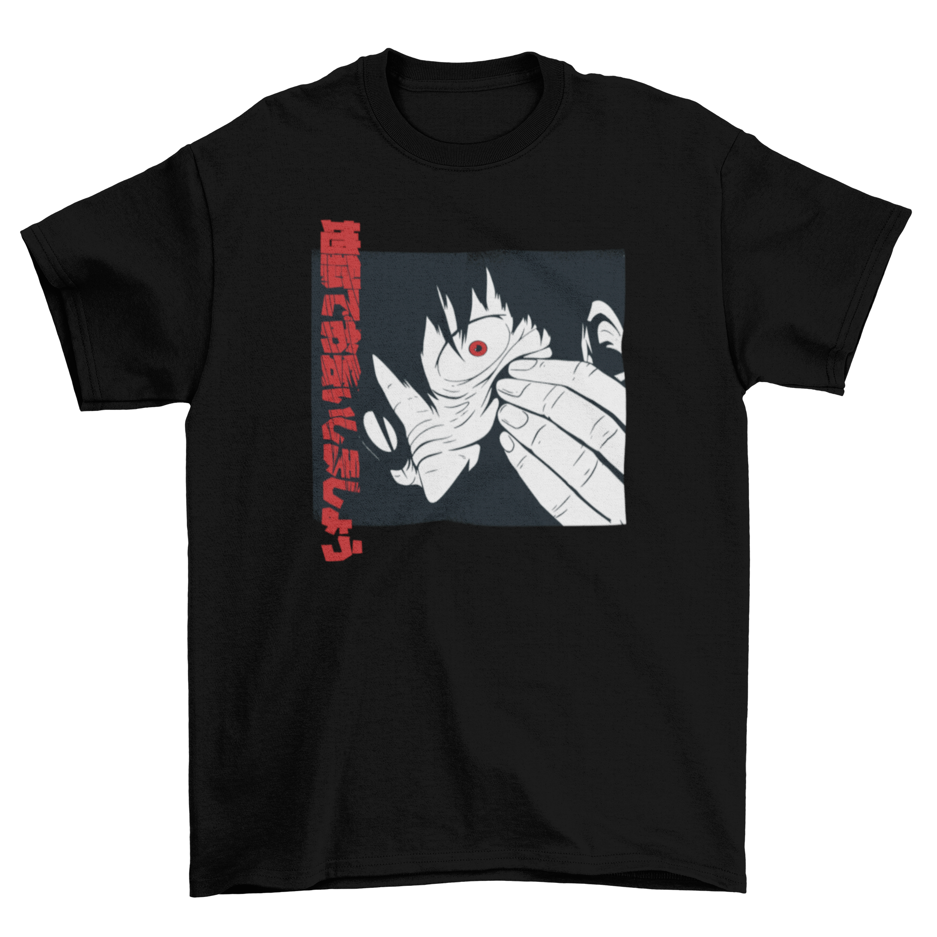 Cool t-shirt design featuring a woman in anime style with a scary face and a Japanese quote that translates to "See you in hell".