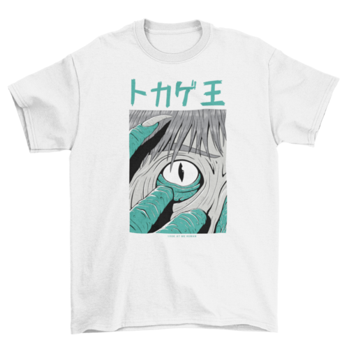 Awesome t-shirt psd featurign a close up of a face with skin of a lizard and a japanese quote that translates to "Lizard king".